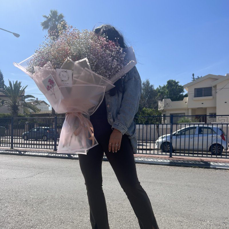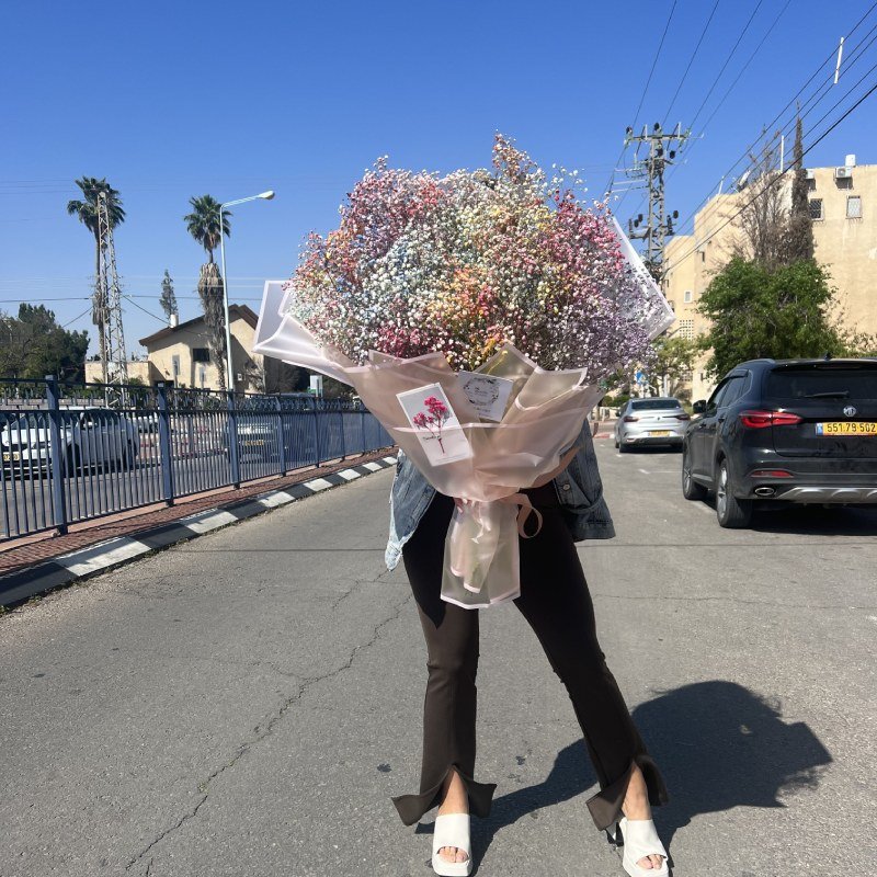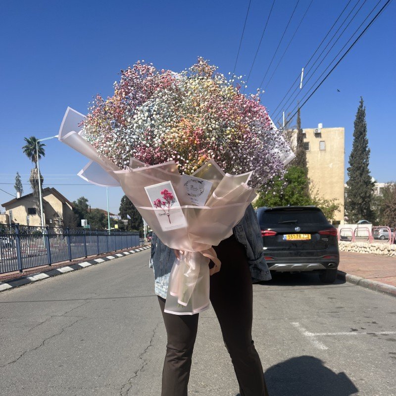 זר פרחים יבשים צבעוני ומרשים (פרחי גיבסנית) בעל נוכחות עטוף בגיליון ורוד ולבן. זר פרחים יבש עמיד יותר לאורך זמן אופנתי ויתאים לכל אירוע שמח או לימים טובים וחגים.